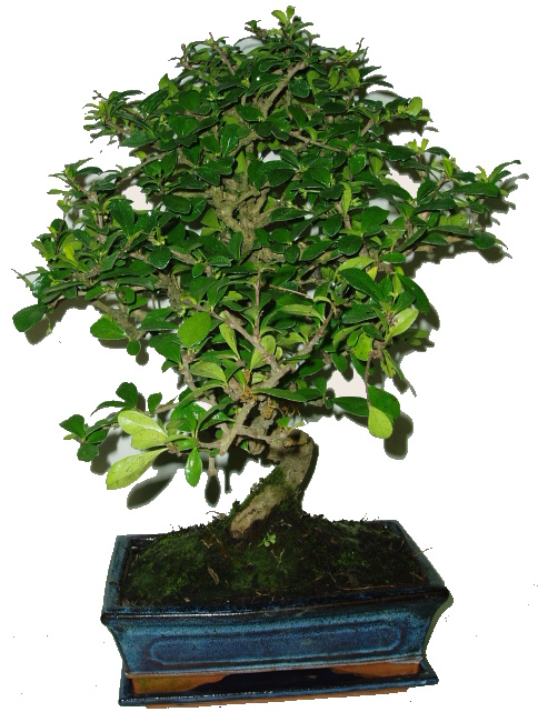 Součástí bonsai je keramická miska i podmiska, kterou vidíte na fotografii.