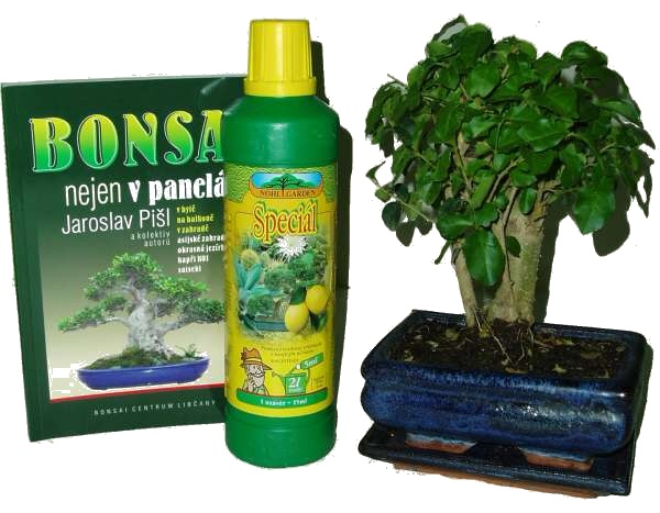 Dárkové balení obsahující bonsaj střední velikosti rovného tvaru a s keramickou miskou i podmiskou a dále příslušenství: hnojivo 0,5l, knihu o pěstování bonsají Bonsai nejen v paneláku.